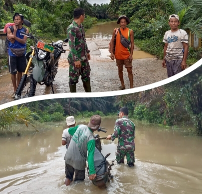 Babinsa Koramil 08/KM Bantu Warga Pengguna Jalan Desa Koto Kombu, Terdampak Banjir Luapan Sungai Ulo
