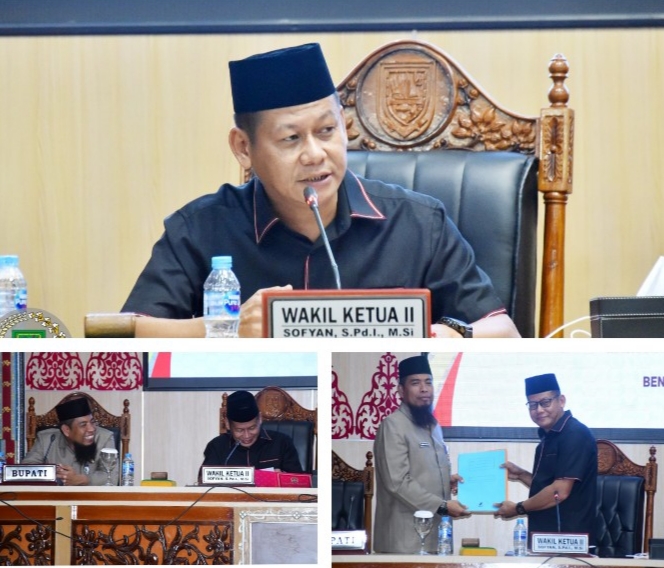 RIAUMADANI. COM, BENGKALIS - Wakil Bupati Bengkalis, Dr H Bagus Santoso menghadiri rapat paripurna DPRD Kabupaten Bengkalis dengan agenda mendengarkan pandangan umum fraksi-fraksi terhadap penyampaian 2 Rancangan Peraturan Daerah.