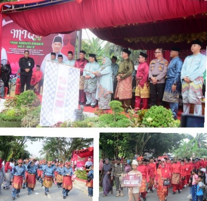 RIAUMADANI. COM, PINGGIR - Bupati Bengkalis Kasmarni didampingi Bupati Bengkalis ke-14 Amril Mukminin secara resmi melepaskan ribuan peserta pawai ta'aruf Musabaqoh Tilawatil Qur'an (MTQ) tingkat Kabupaten.