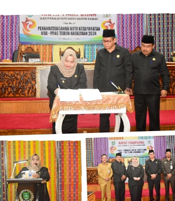 RIAUMADANU. COM, BENGKALIS - Bupati Bengkalis Kasmarni bersama Wakil Ketua Dewan Perwakilan Rakyat Daerah (DPRD) Kabupaten Bengkalis H Sofyan, menandatangani Nota Kesepakatan tentang Kebijakan Umum Anggaran (KUA) dan Prioritas Plafon Anggaran.