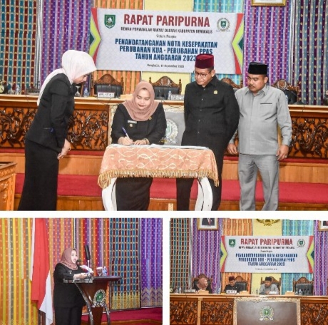 RIAUMADANI. COM, BENGKALIS - Bupati Bengkalis Kasmarni menandatangani Memorandum of Understanding (MoU) Perubahan Kebijakan Umum Anggaran dan Prioritas Plafon Anggaran Sementara (KUA-PPAS), bersama Pimpinan DPRD Bengkalis, Sofyan dan Syaiful Ardi.