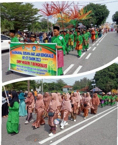 RIAUMADANI. COM, BENGKALIS - Dalam rangka memeriahkan hari jadi Bengkalis yang Ke 511 Tahun 2023 SMP N 7 Bengkalis Desa Teluk Latak Kecamatan Bengkalis Kabupaten Bengkalis mengikuti acara pawai Karnaval Budaya.