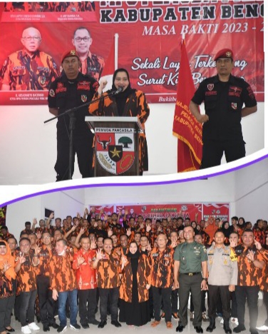 RIAUMADANI. COM, BUKIT BATU - Bupati Bengkalis Kasmarni menyaksikan langsung pelantikan Pengurus Majelis Pengurus Cabang (MPC) Pemuda Pancasila (PP) Kabupaten Bengkalis masa bakti 2023-2027, di Kecamatan Bukit Batu, Kamis, 20 Juli.