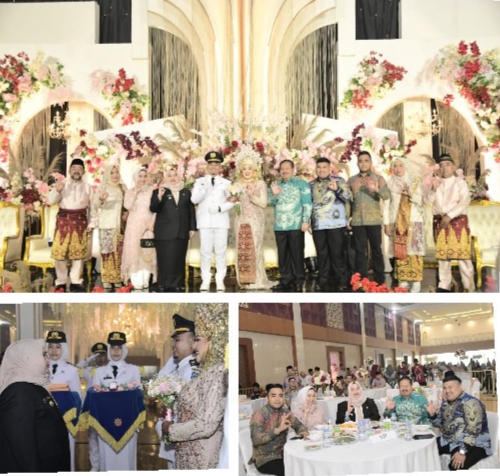 RIAUMADANI. COM, PEKANBARU - Bupati Bengkalis Kasmarni memimpin upacara pernikahan purna praja Institut Pemerintah Dalam Negeri (IPDN) Gunawan Handra, S.IP., M.IP dan dr. Dwi Adlina Itami di Susiana Tabrani Convention Hall Pekanbaru Sabtu, 22 Juli.