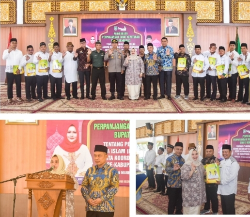 RIAUMADANI. COM, BENGKALIS - Bupati Bengkalis Kasmarni menyerahkan perpanjangan keputusan untuk para Penggiat/Penyuluh Agama Islam (Da'i) desa/kelurahan, serta Koordinator Kecamatan SE Kabupaten Bengkalis, di Balai Kerapatan Wisma Sri Mahkota.