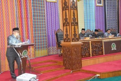 BENGKALIS - Bupati Bengkalis Kasmarni diwakili Wakil Bupati H Bagus Santoso, memberikan jawaban dari pandangan umum fraksi-fraksi Anggota DPRD Bengkalis, atas tiga Rancangan Peraturan Daerah (Ranperda), pada sidang Paripurna DPRD Bengkalis, Selasa,.