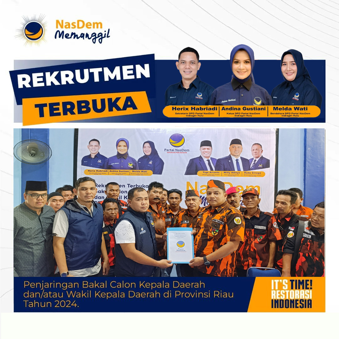 Rengat, Inhu, RIAUMADANI. Com- DPD Partai NasDem Kabupaten Indragiri Hulu (Inhu) telah membuka pendaftaran Bakal Calon Kepala Daerah dan atau Wakil Kepala Daerah, mulai 1 Mei 2024 sampai dengan 7 Mei.