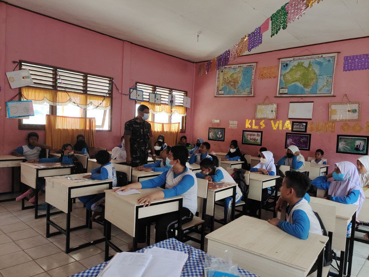 TAPUNG HILIR - Sertu Dedi Isriadi Babinsa koramil 16/Tapung Kodim 0313/Kampar memberikan materi wawasan kebangsaan (wasbang) kepada siswa-siswi SD Negri 003 Desa Kota Garo Kecamatan Tapung Hilir Kabupaten Kampar. Senin.