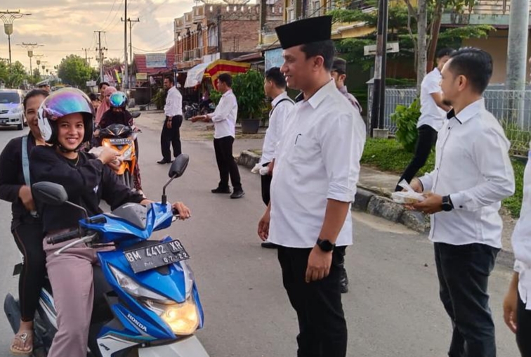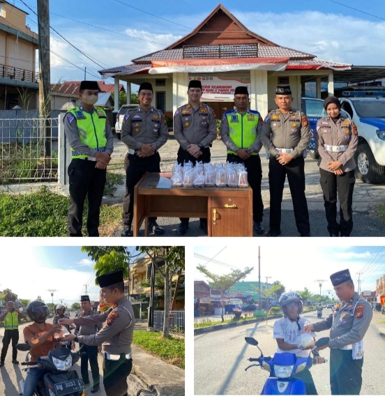 RIAUMADANI. COM. TELUK KUANTAN - Satuan Lalulintas (Satlantas) Polres Kuantan Singingi (Kuansing) melaksanakan bagi takjil bagi pengguna jalan di sekitar jalan Proklamasi Kelurahan Sei.