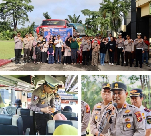 RIAUMADANI. COM, TELUK KUANTAN - Kapolres Kuansing AKBP Pangucap Priyo Soegito,S.IK,MH melepas sebanyak 60 orang pemudik arus balik yang mengikuti program balik gratis bersama Polres.