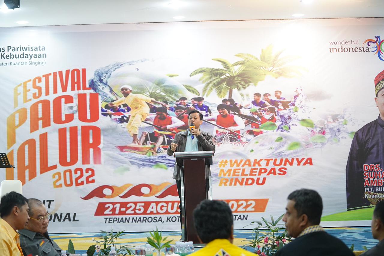 PEKANBARU — Plt Bupati Kuantan Singingi Drs.H Suhardiman Amby,. Ak, MM bersama panitia pelaksana menggelar ekspos kesiapan pelaksanaan Pacu Jalur Tradisional Event Nasional.