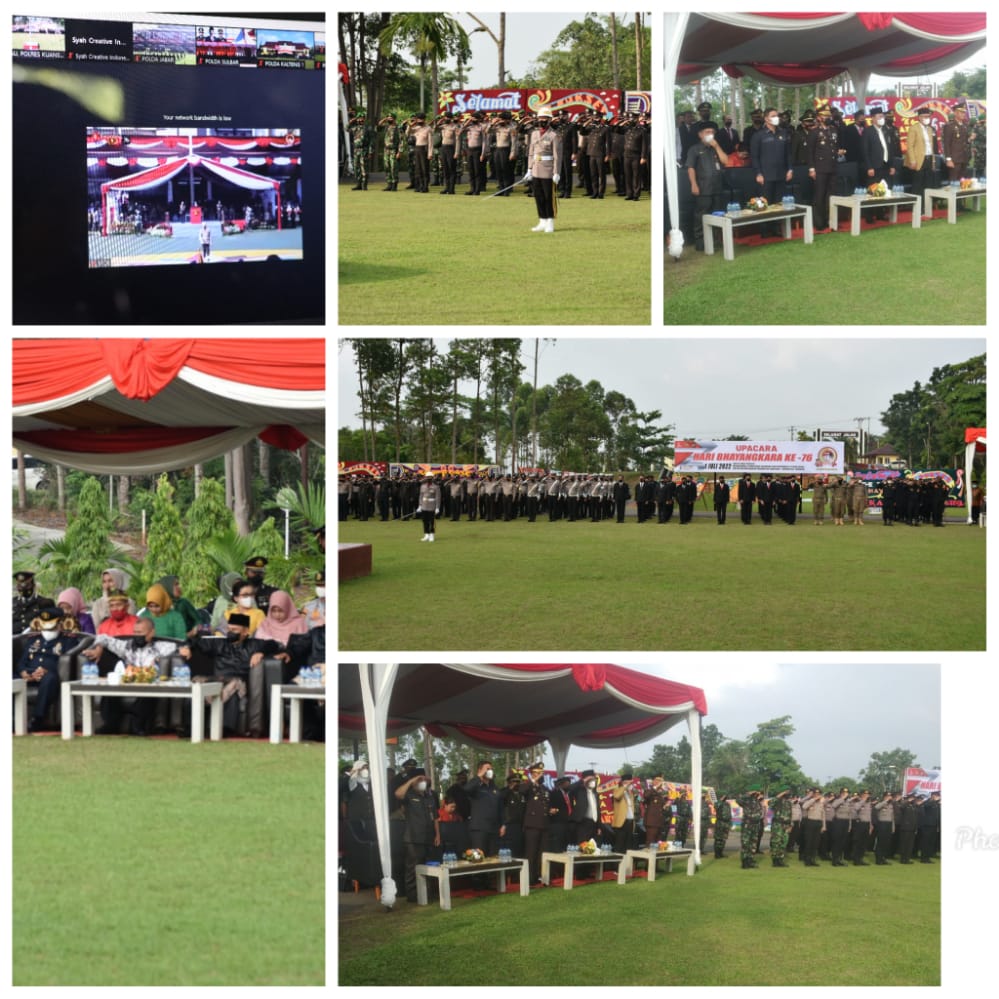 TELUK KUANTAN - Kapolres Kuansing AKBP Rendra Oktha Dinata, SIK M.Si pimpin Upacara Hari Bhayangkara ke 76 Tahun 2022 Secara Virtual di Halaman Mapolres Kuantan Singingi, selasa.