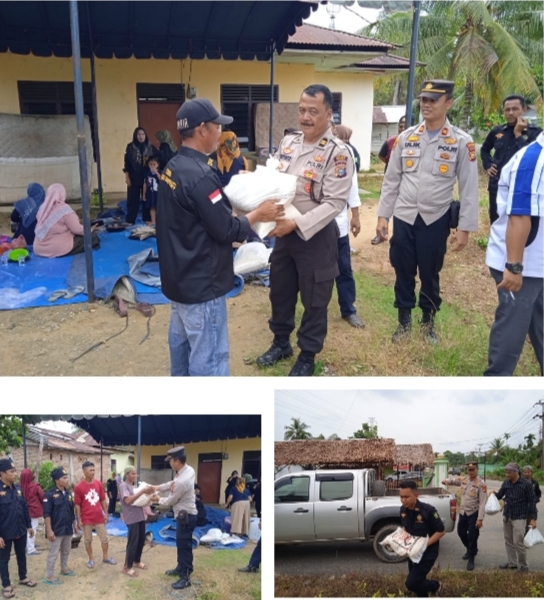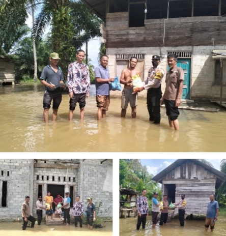 RIAUMADANI. COM. ROKAN HULU - Personil Polsek Kepenuhan Polres Rokan Hulu (Rohul) melakukan pendampingan Pemerintah Desa dalam pembagian sembako bagi Warga yang terdampak bencana Banjir,.