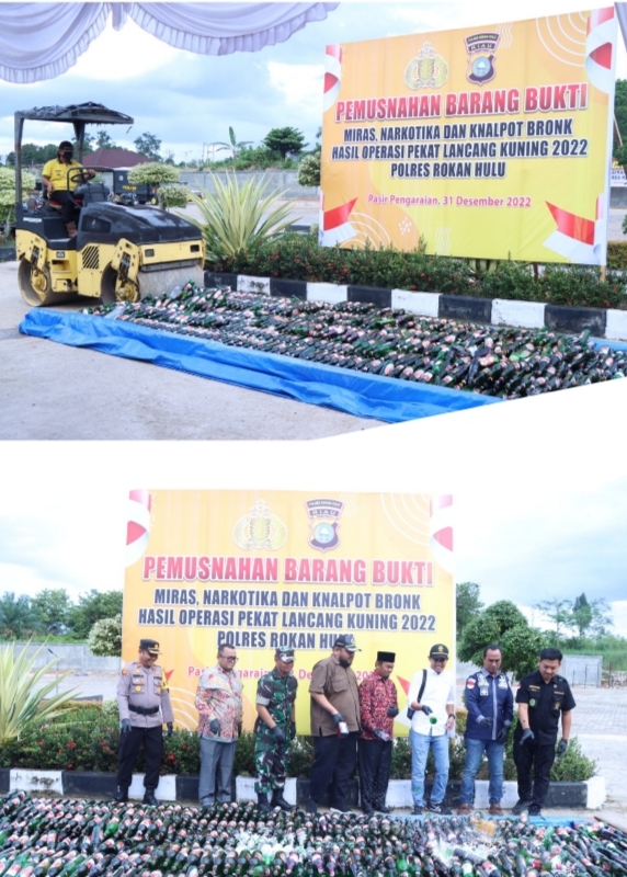 RIAUMADANI. COM, ROKAN HULU - Pemusnahan Barang Bukti Miras, Narkotika dan Knalpot Brong hasil Operasi Pekat Lancang Kuning (LK) 2022 Polres Rokan.