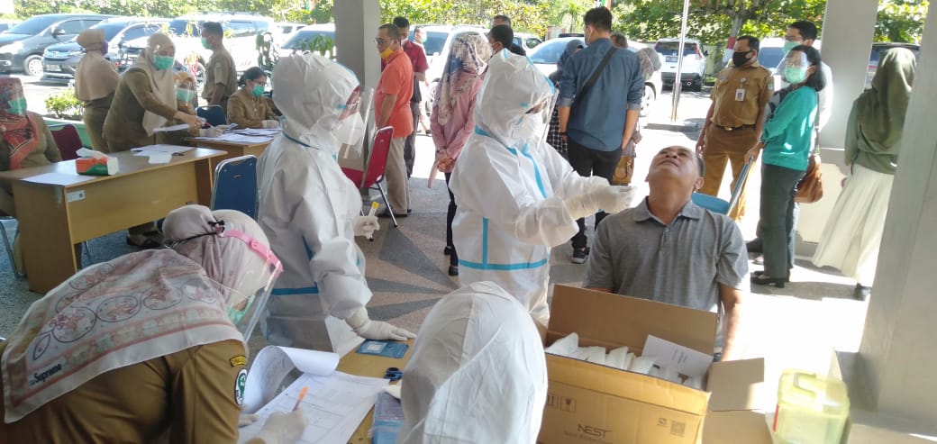 ROKAN HULU. RIAUMADANI. COM - Puluhan Aparatur Sipil Negara (ASN) di lingkungan Pemerintah Kabupaten (Pemkab) Rokan Hulu menjalani tes swab mereka terlihat tegang saat petugas mengambil sample swab. Apalagi sebelumnya, tersebar kabar seorang PNS.