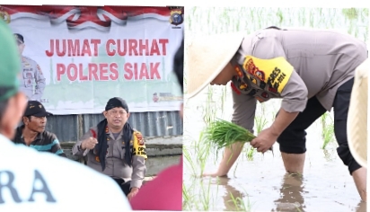 RIAUMADANI. COM, SIAK - Kepala Kepolisian Resor Siak AKBP Asep Sujarwadi, SIK, M.S.I turun langsung kesawah bersama para petani dalam program Jumat Curhat kepada masyarakat di Kampung.