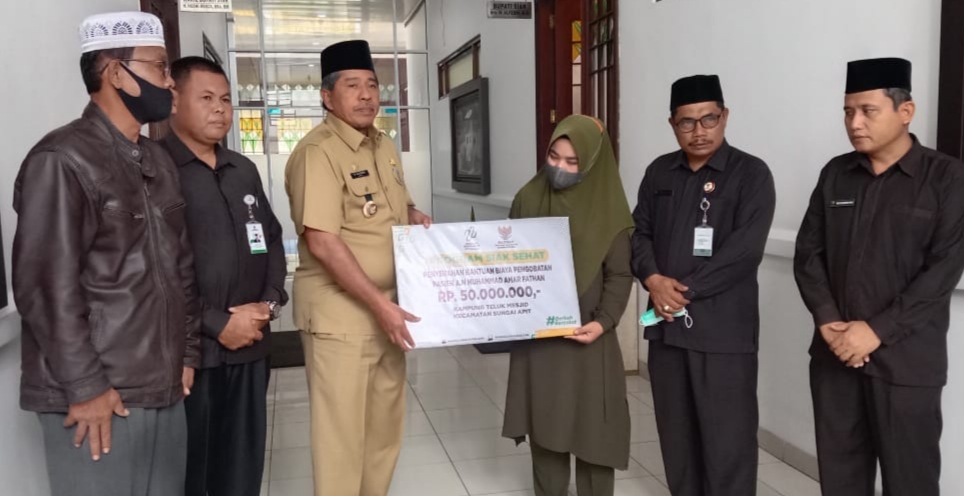 Bupati Siak Alfedri didampingi Komisioner Badan Amil Zakat Nasional (BAZNAS) kabupaten Siak Samparis menyerahkan bantuan biaya perobatan Program Siak.