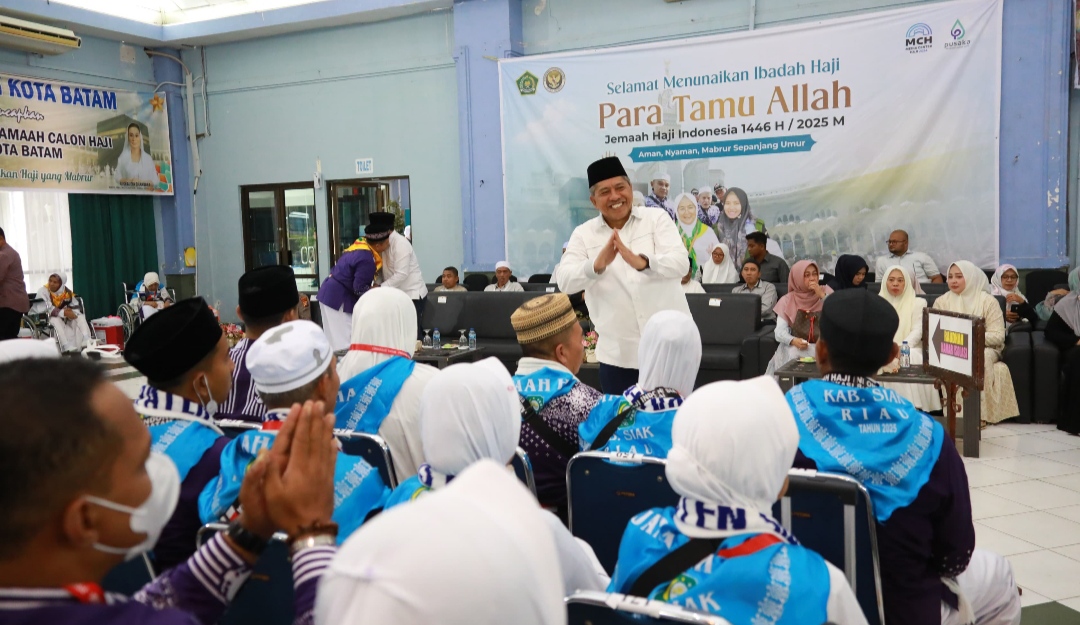 BATAM, RIAU MADANI. COM - Suasana penuh haru, menyelimuti pelepasan keberangkatan Calon Jemaah Haji (CJH) asal Kabupaten Siak Menuju Mekah, berlangsung di aula Embarkasi Batam, Senin.