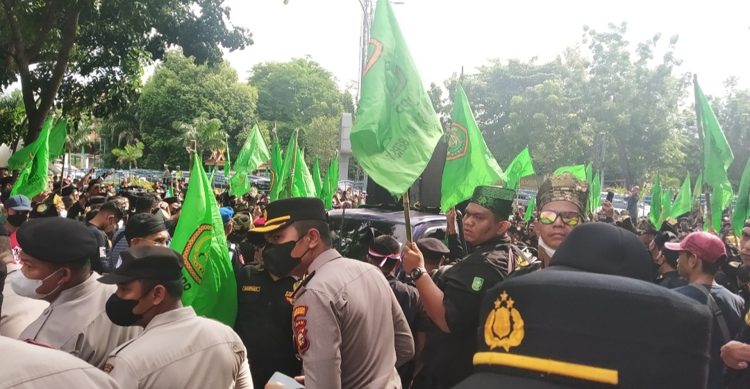 PEKANBARU - Ribuan massa dari Lembaga Laskar Melayu Bersatu (LLMB) melakukan aksi damai digedung Dewan Pimpinan Rakyat Daerah (DPRD) Provinsi.