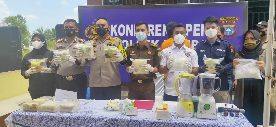 RIAUMADANI. COM - Kapolresta Pekanbaru Kombes Pol. Dr. Pria Budi, S.I.K., M.H., melakukan pengungkapan dan pemusnahan benda sitaan/barang bukti Narkotika Jenis Shabu di halaman Depan Mako Polsek Rumbai. Jum at,.