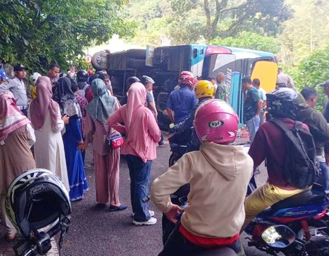 RIAUMADANI. COM, PEKANBARU - Bus yang berisi mahasiswa Universitas Riau (Unri) alami kecelakaan di Jalan Silaiang Bawah, Kota Padang Panjang, Provinsi Sumatera Barat (Sumbar), Senin (19/12/2022) pagi. Video kondisi bus terbalik di tengah jalan viral.