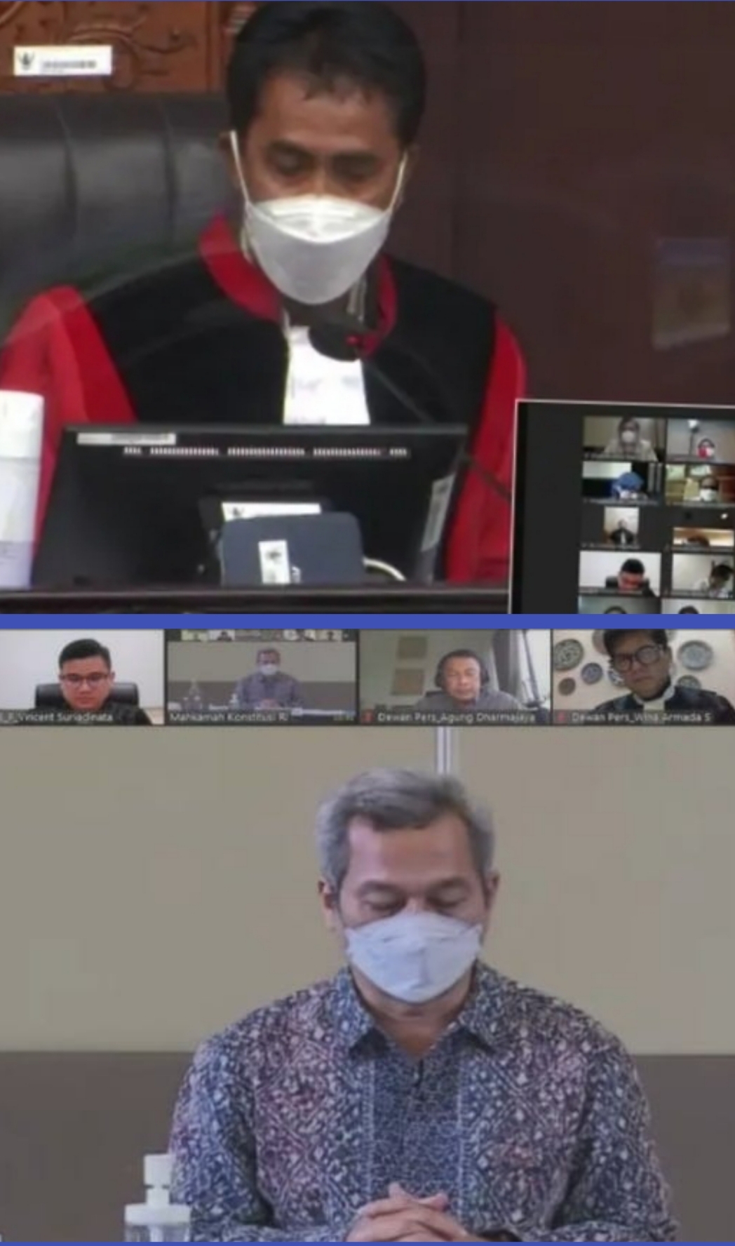 RIAUMADANI. COM – Presiden Republik Indonesia Joko Widodo memberikan keterangan tertulis secara daring pada sidang Uji Materi pasal 15 Ayat (2) huruf f dan ayat (3) Undang-Undang Nomor 40 Tahun 1999 Tentang Pers di Gedung Mahkamah.