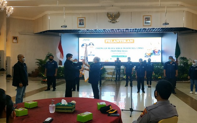 RIAUMADANI. COM - Pelantikan pengurus Jaringan Media Siber Indonesia (JMSI) Provinsi Riau yang berlangsung di Balai Serindit Gedung Daerah, Pekanbaru, Senin (25/1/2021) berjalan.